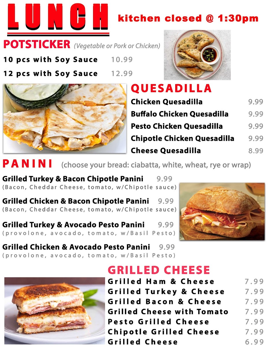 Cafe Lucky Bones offers a delectable selection of lunch sandwiches, potstickers, and quesadillas that cater to a variety of tastes. Imagine sinking your teeth into a Homemade Chicken Salad Sandwich for just $8.99, where the luscious, creamy salad meets a fresh, soft bread, leaving you craving for more. Or perhaps you may prefer a classic Turkey B.L.T. or the ever-popular Tuna Salad B.L.T. ($10.99) — perfect for those who enjoy a twist on traditional favorites.